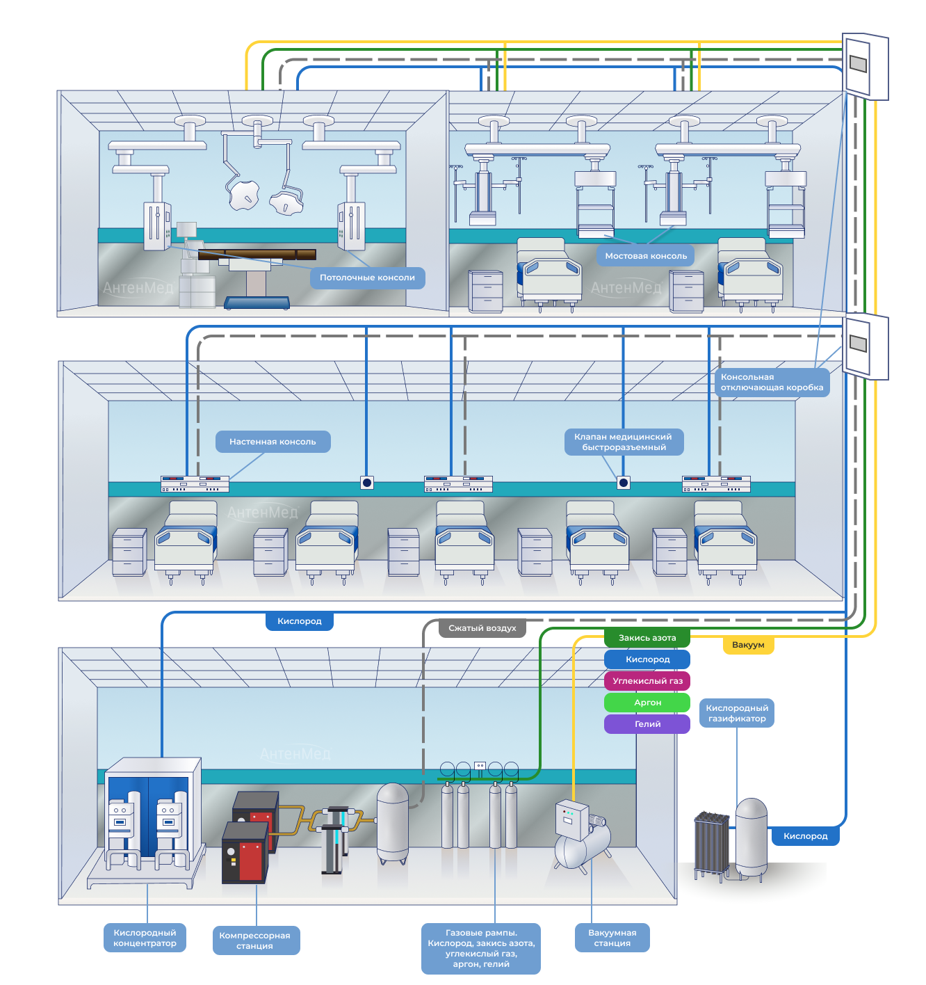 Имея большой опыт работы в отрасли медицинских газов, компания ООО «АнтенМед» использовала свои наработки для решения многих задач медицинских газовых систем, тесно сотрудничая с заказчиком для предоставления наилучшего возможного решения. Мы зарекомендовали себя как надежный партнер по поставкам оборудования для систем медицинских газов и комплексного монтажа. Обладая собственными проектными, производственными и монтажными возможностями, ООО «Антенмед» может качественно оказать услуги по оснащению лечебного учреждения медицинским газовым оборудованием и произвести монтаж всей системы. Специалисты нашей компании проводят всесторонний анализ потребностей лечебного учреждения и смогут ответить на все интересующие Вас вопросы.